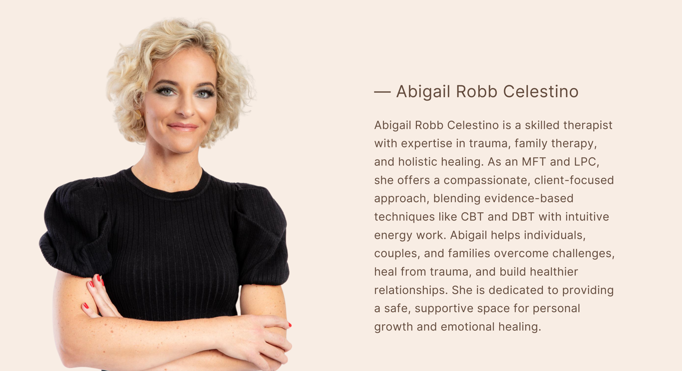 “I have been a patient of Abigail's for over a year now, and I couldn't give a higher recommendation. My time with her has helped me, and is still continuing to help me overcome many difficult things in my life, including, religious trauma/abuse, emotional trauma/abuse, codependency, family dynamics, boundary setting and so much more. She is a guiding light who has led me to mindful meditation, and thoughtful reflection among other tools that aid me in my healing journey. She is not only my therapist, but also mine and my husband's marriage counselor. Her guidance is what saved our marriage. Her thoughtful, caring approach and mediation is still something we each seek out together and individually on a weekly and a monthly basis. I plan to seek out her energy services next. She is the best decision I've made for myself and for my marriage.”